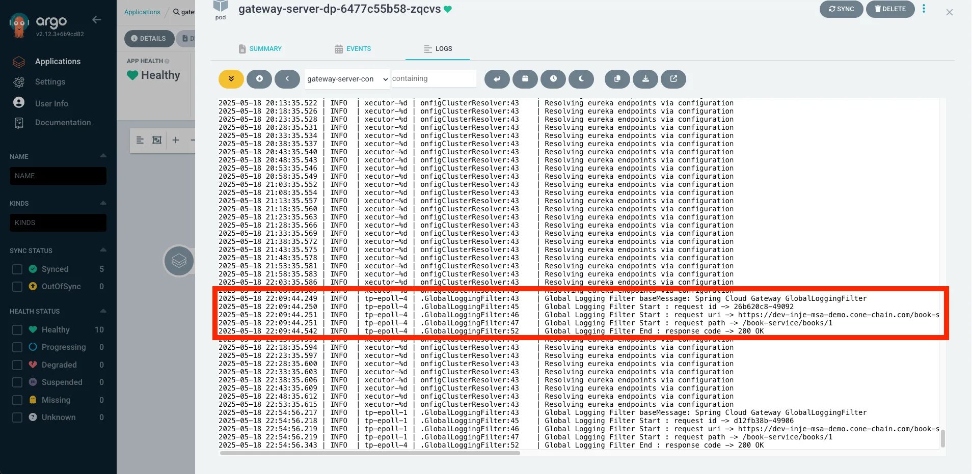 다음은 Gateway에서 요청을 처리할 때 남는 로그 예시입니다. GlobalLoggingFilter를 통해 요청 URI, Path, 응답 코드 등이 기록됩니다.