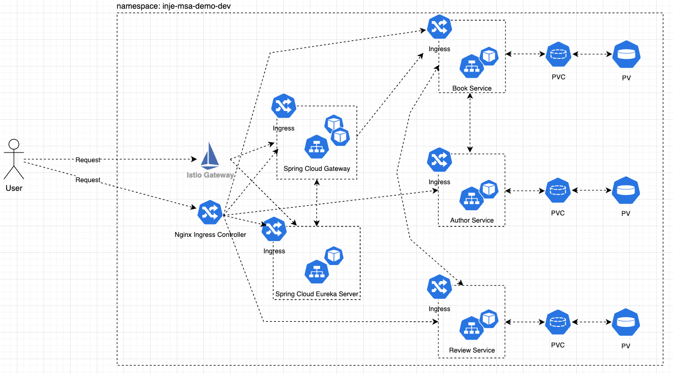 사용자가 inje-msa-demo-dev라는 namespace에 위치한 dev 환경의 Book Service의 조회 API를 호출하면 해당 조회 API는 같은 네임스페이스 내부에 위치한 Author Service, Review Service의 API를 내부적으로 호출하여 받아온 결과를 조합하여 최종적으로 Book 조회 API의 응답으로 보내주는 것을 가정한 마이크로서비스 예시입니다.
