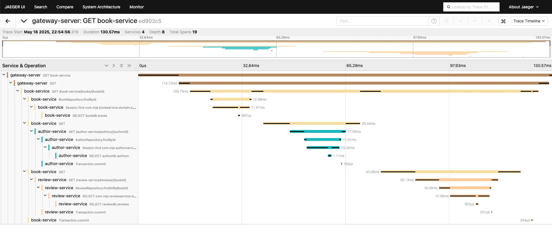 - 분산 트레이싱 지원 : Jaeger 연계를 통해 각 요청이 Gateway → Book → Author / Review 순으로 흘러가는 구조를 시각화할 수 있음