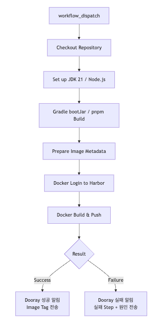 개발팀은 이미 GitHub Enterprise에서 PR, 코드 리뷰, Dooray 연동까지 완성된 개발 워크플로를 운영하고 있었다. CI/CD도 이 흐름 위에 자연스럽게 얹는 것이 맞았다. FE/BE 개발자가 알아야 하는 것은 Dockerfile 작성과 GitHub Actions 워크플로 정도로 한정했다. 새로운 도구(Tekton, Gitea)를 학습하거나, 기존 개발 워크플로를 바꿀 필요가 없도록 했다.
