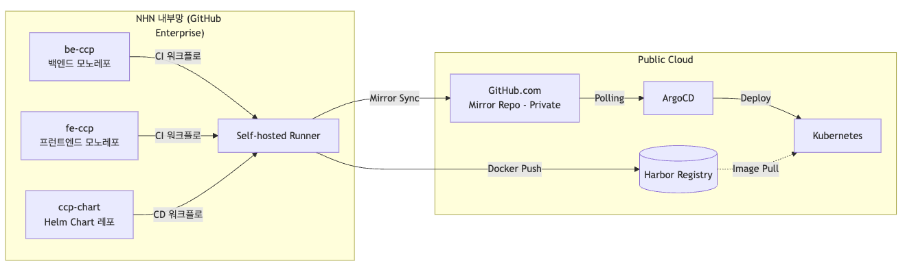 전체 흐름은 CI(이미지 빌드) → CD(차트 태그 업데이트) → GitOps 배포의 3단계로 구성된다. Self-hosted Runner가 내부망과 외부망의 브릿지 역할을 하며, CI에서는 Harbor로 이미지를 push하고, CD에서는 Mirror Repository로 Chart 변경사항을 동기화한다.