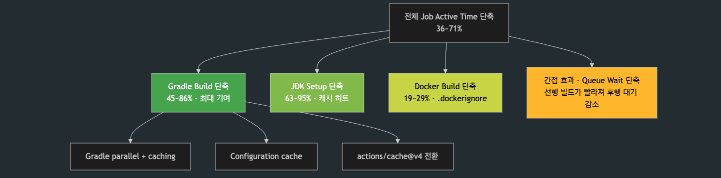 오죽 병목이 심했으면 GitHub Actions 워크플로우 파일을 전부 뜯어고쳤을까. 코드 레벨에서 풀 수 있는 방안을 찾아서 실제로 풀었고, 결과는 수치로 증명했다.