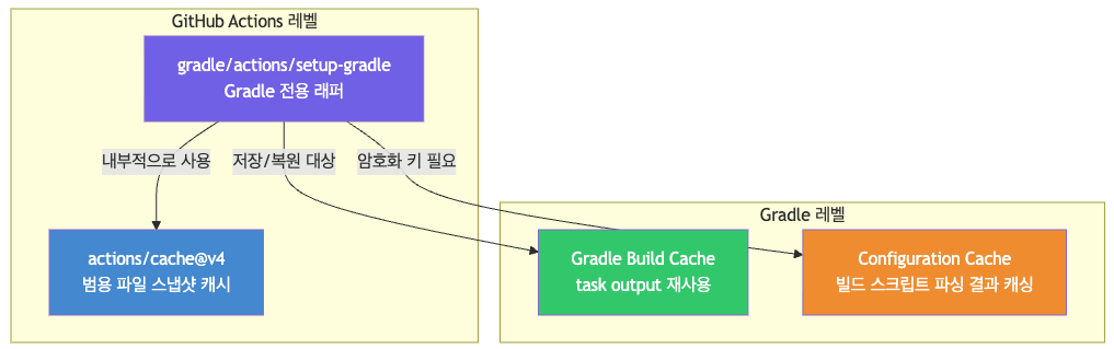 한 문장으로: GitHub Actions의 actions/cache@v4는 범용 파일 캐시이고, setup-gradle은 그 위에 Gradle 전용으로 최적화된 래퍼이며, Gradle의 Build Cache는 task output 재사용이라는 근본적으로 다른 계층의 메커니즘이다.